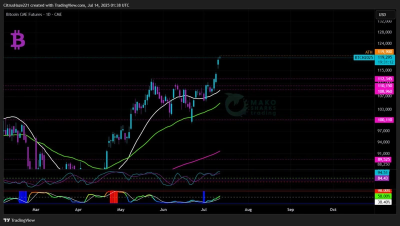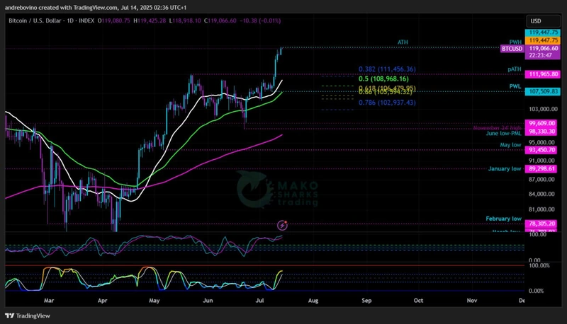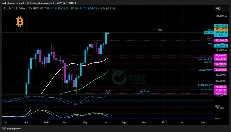 Die Hopium-Rhapsodie ist in vollem Gange, während Bitcoin mit 119.400 ein neues Allzeithoch erreicht! Für Bullen ist der Fahrplan klar: Halten Sie sich über dem Tief der Vorwoche bei 107.500 und dem täglichen 55EMA bei 107.300 auf Tagesbasis während der Woche.