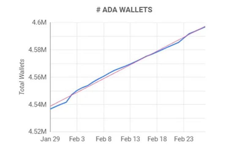 Daten, die von Cardano Blockchain Insights stammen, zeigen einen bemerkenswerten Anstieg von fast 90 % bei der Erstellung von Wallets zwischen dem 22. und 23. Februar, wobei die Zahl von 1.706 auf 3.227 anstieg. Obwohl sich die Wachstumsrate seither leicht abgeschwächt hat, bleibt der Gesamttrend positiv und die Gesamtzahl der Wallets nähert sich 4,6 Millionen.