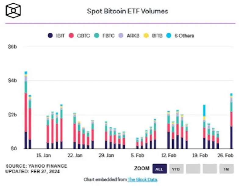 Darüber hinaus verzeichneten die neun neugeborenen ETFs gestern einen neuen Tagesrekord beim Handelsvolumen, das 2,4 Mrd. USD erreichte, angeführt von BlackRocks ETF, der die Marke von 1 Mrd. USD überschritt und damit den bisherigen Tagesrekord vom ersten Handelstag der Instrumente übertraf.