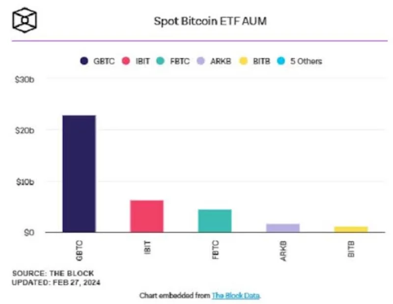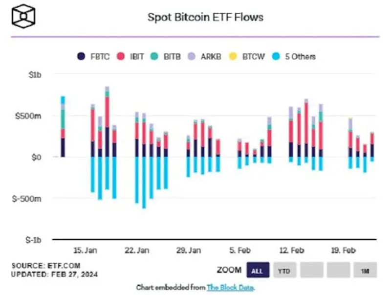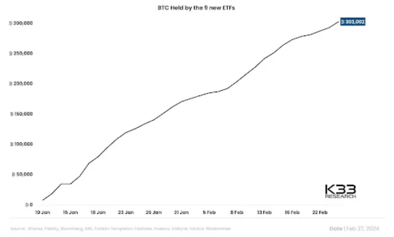 Jüngste Daten von K33 Research zeigen, dass diese neun ETFs zusammen 303.002 BTC angehäuft haben, was nach den gestrigen Schlusszahlen einem Wert von etwa 17 Milliarden US-Dollar entspricht. Zu dieser Kohorte von ETFs, die am 11. Januar aufgelegt wurden, gehören renommierte Unternehmen wie BlackRock (IBIT), Fidelity (FBTC), Bitwise (BITB), Ark Invest 21Shares (ARKB), Invesco (BTCO), VanEck (HODL), Valkyrie (BRRR), Franklin Templeton (EZBC) und WisdomTree (BTCW), die eine Vielzahl von Akteuren repräsentieren, die in die Bitcoin-Investitionsarena einsteigen.